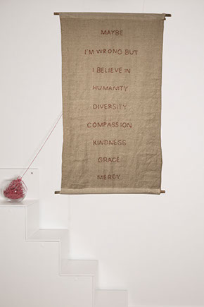 Manifesto "Bundeslade - Apell an die Menschlichkeit", antiker Leinenstoff (150Jahre, Weiberei in Brandenburg) von Tina Griffith, 2024/25